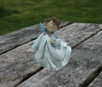 Dieser Engel hält einen Vogel auf der Hand und sehr festlich im silbernen Kleid. Der Engel ist bunt, silbern und aus Polyresin und 7x12cm gross