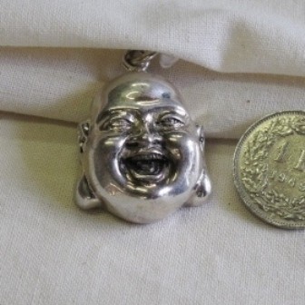 Der Buddha Kopf ist aus 925 Silber mit Verantwortlichkeitsmarke. Der Kopf ist 25x35mm gross und ca. 18g schwer.