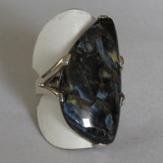 Der Pietersite hat ein faszinierendes Farbenspiel aus der Gruppe der Quarze. Mit dem speziellen Schliff kommt die irisierende Farbe erst richtig zur Geltung. Der Stein ist 32mm lang und 11mm breit. Diesen Ring bieten wir in der Grösse 51 an.