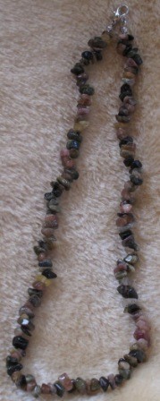 Diese Turmalinkette mit allen Turmalinarten und Turmalinfarben ist von uns angefertigt und auf Schmuckdraht aufgezogen und mit einem Silberschloss abgeschlossen. So ist die Kette Wasserfest und sehr Strapazierfähig.